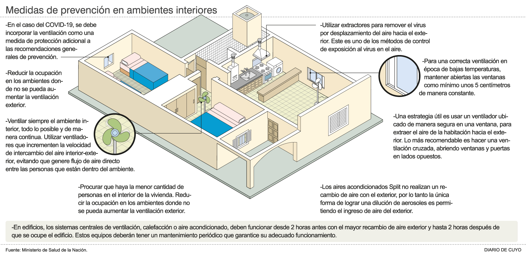 Abrir puerta y ventanas no es suficiente para ventilar correctamente el interior de una casa, edificio, escuela, etc., y eliminar el virus. Para un resultado efectivo hay que tener en cuenta desde la cantidad de ocupantes hasta el uso de algunos elementos que ayudan a realizarla con mayor rapidez y alcance. Lo importante es que todas son medidas sencillas de aplicar (ver infografía).