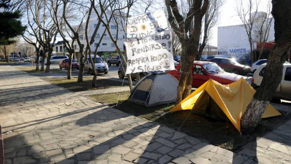 Los carteles y banderas con mensajes en contra de la gobernadora que mantiene hoy un fuerte conflicto con el gremio ATE, acompañaron el allanamiento en la Casa de Gobierno. Los trabajadores que permanecen en el acampe en los jardines del edificio, fueron sorprendidos por los móviles federales que ingresaron por una puerta lateral. El personal administrativo se retiró minutos después de iniciado el operativo.