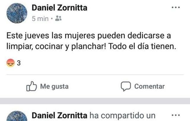 "Este jueves las mujeres pueden dedicarse a limpiar, cocinar y planchar! Todo el día tienen", escribió Zornitta en su cuenta personal. La frase fue rechazada por todo el espectro político rionegrino y sus propios colegas. De inmediato, el fiscal Marcelo Alvarez adelantó que se tomarían las medidas disciplinarias correspondientes.