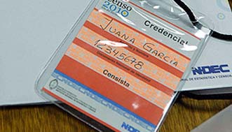 Antes de mostrar la credencial, Varela también presentó el equipo que portarán los censitas, que consiste en los formularios, tabla de apoyo, listado de poblaciones indígenas, lápiz, sacapunta y goma, todo dentro de un bolso de plástico transparente -con el logotipo del censo- para llevar colgado del hombro.