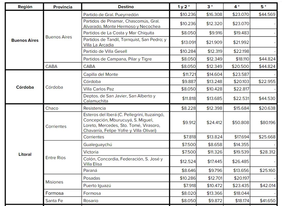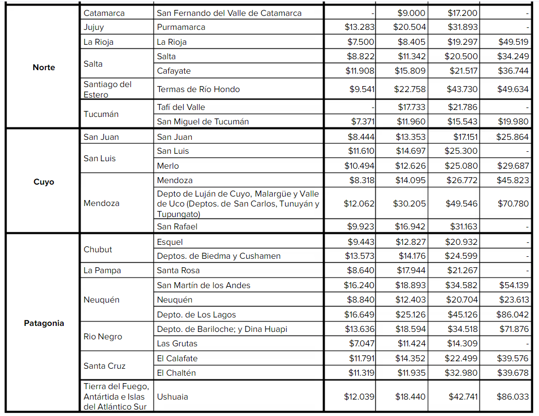En San Juan, en tanto, los hoteles de entre 1 y 2 estrellas cobrarán hasta $8.444. Mientras que, la tarifa para los hoteles de 3 estrellas llegan a los $13.353 y los de 4 estrellas, hasta los $17.151. En tanto que, el precio máximo para los de 5 estrellas es de $25.864.