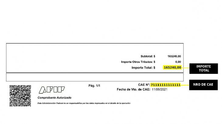 El código de autorización electrónica (CAE) suele aparecer al pie de la factura (en el ejemplo es 7111111111111)