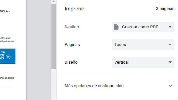 Si no llegó el adjunto, se debe enviar a imprimir el correo electrónico (pero no hacerlo) y elegir en el formato impresión la opción "Guardar como PDF". Así, el archivo se descarga en la PC o celular y puede ser adjuntado en el Previaje.