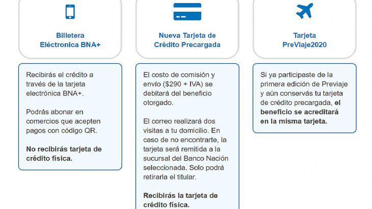 – Si es la primera vez que participa del Previaje se debe elegir entre "Billetera Electrónica del BNA+" (del Banco Nación) o una "Nueva Tarjeta de Crédito Precargada", que se utilizará como cualquier otra tarjeta.