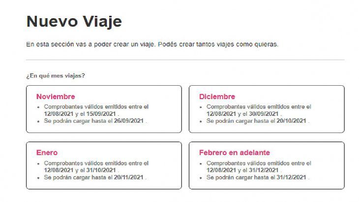 Hay que ir a la opción "Mis viajes" y apretar el botón "Nuevo viaje" para ingresar la información sobre los viajes adquiridos. En este punto se solicitará declarar: