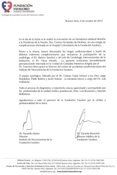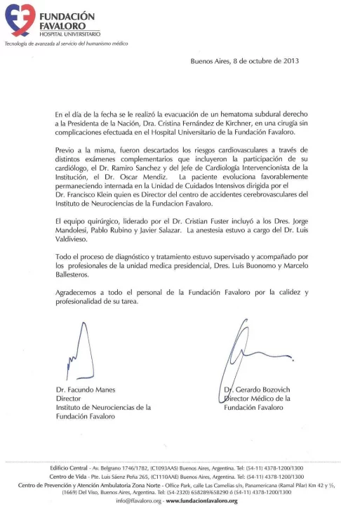 Buenos Aires 8 de octubre.- La operación a la que fue sometida Cristina Fernández de Kirchner "ha sido satisfactoria", así lo informó el secretario de Comunicación Pública en la puerta de la Fundación Favaloro.