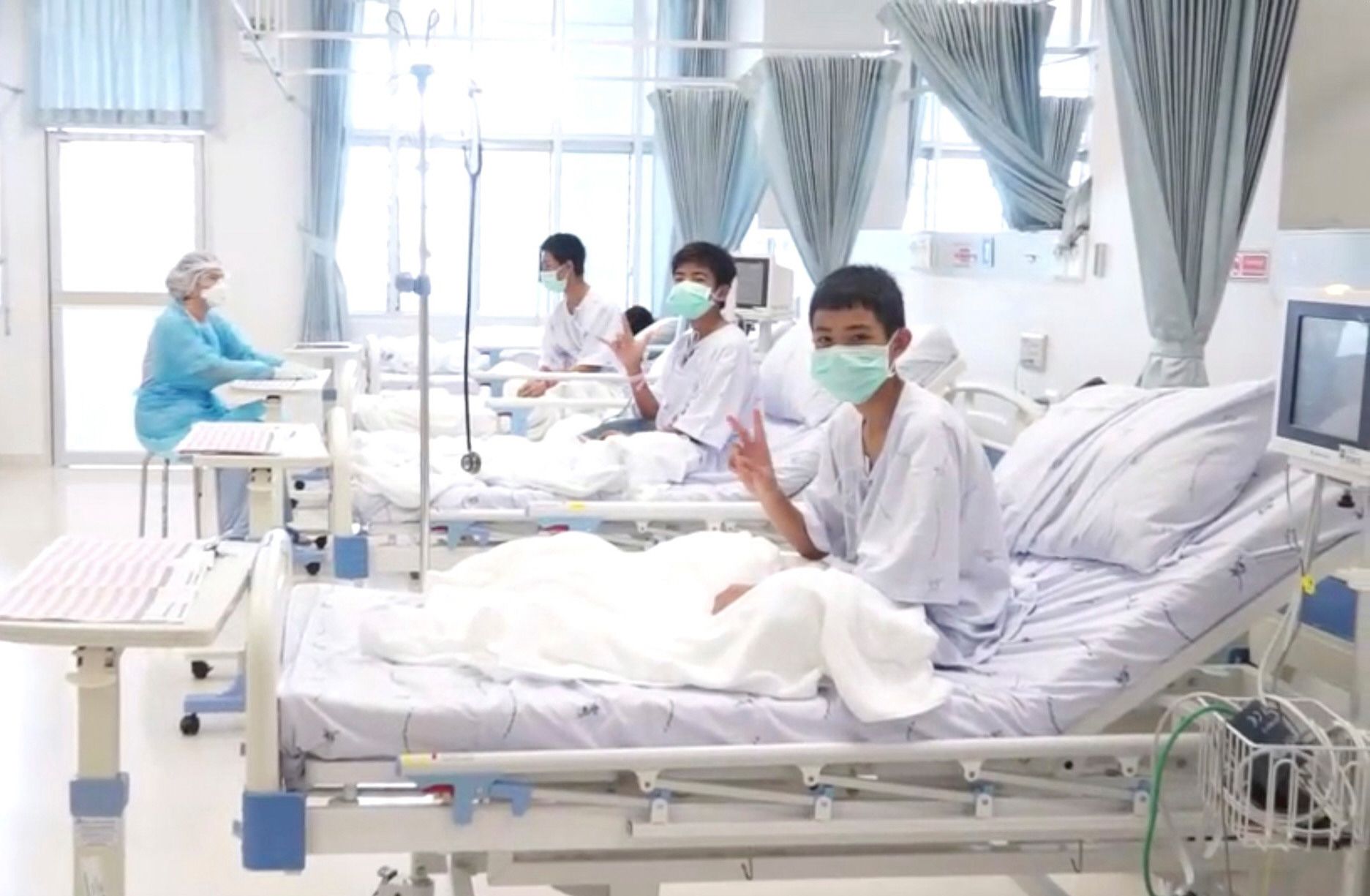 La grabación, distribuida por el servicio de prensa del operativo de rescate, muestra a los muchachos sentados en camillas y con máscaras en las caras, alguno haciendo a cámara el símbolo de la victoria con las manos.