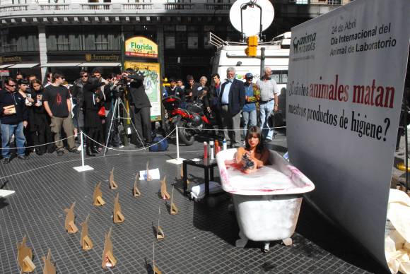 Una performance con una mujer inmersa en una bañera con agua color sangre rodeada de conejos de cartón buscó ayer concientizar a los porteños que pasaban por la esquina de Diagonal Norte y Florida respecto de los miles de animales que mueren anualmente en el mundo utilizados en el testeo de los productos cosméticos y de higiene.