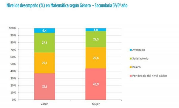 En 5°/6° año del secundario, el 46,4% están por debajo de lo aceptable; la mitad de ellos no comprenden un texto muy sencillo y el otro 50% demostró competencias muy básicas, es decir, apenas llegan a sacar conclusiones vagas sobre el contenido. Entonces, solo el 53,6% de los estudiantes alcanzan niveles de desempeño Satisfactorio/Avanzado.