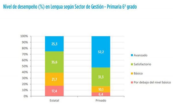 "Los estudiantes que asisten al sector privado alcanzan elevados niveles de desempeño ‘Satisfactorio Avanzado’, que duplican al porcentaje de los estudiantes de gestión estatal. A su vez, en el sector estatal, el porcentaje de estudiantes que alcanzan desempeños ‘Por debajo del Nivel Básico y Básico’ casi duplican a los del secundario", explicaron desde la cartera nacional de Educación.