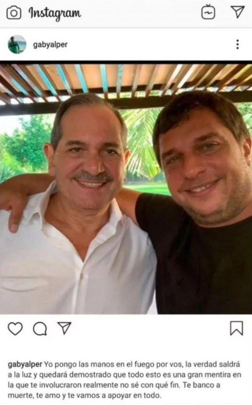 El mayor, Gabriel Alperovich, le dedicó a su padre y actual senador nacional aliado del kirchnerismo un posteo en Instagram. "Pongo las manos en el fuego por vos, la verdad saldrá a la luz y quedará demostrado que todo esto es una gran mentira en la que te involucraron, realmente no sé con qué fin", escribió junto a una foto en la que están abarazados.