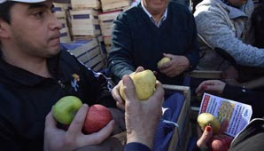 Buenos Aires.- Productores frutihortícolas de Río Negro y Neuquén realizaron una protesta en Plaza de Mayo regalando manzanas y peras a quienes realizaron interminables colas, para concientizar a los consumidores y a las autoridades por la falta de rentabilidad del sector, que da trabajo a más de 60 mil personas en el sur del país.