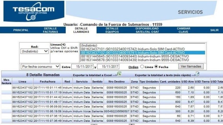 Desde Tesacom explicaron a Clarín que el detalle de las ocho llamadas fue enviado a la Armada de manera exclusiva desde el momento en que se comenzó la búsqueda: “No es nuevo”, dicen de la empresa y agregaron que sólo ellos tenían la información. También explicaron que las comunicaciones son desde el submarino hacia el continente.