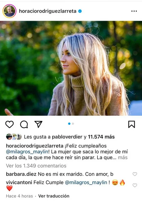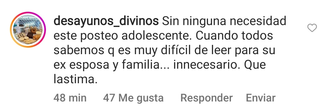 Pero el mensaje no cayó del todo bien en su ex pareja que le dedicó una serie de mensaje. El primero fue tras un comentario de una persona que le escribió a Larreta. "Sin ninguna necesidad por este posteo adolescente cuando todos sabemos que es muy difícil leer para su ex esposa y familia… innecesario. Qué lástima".