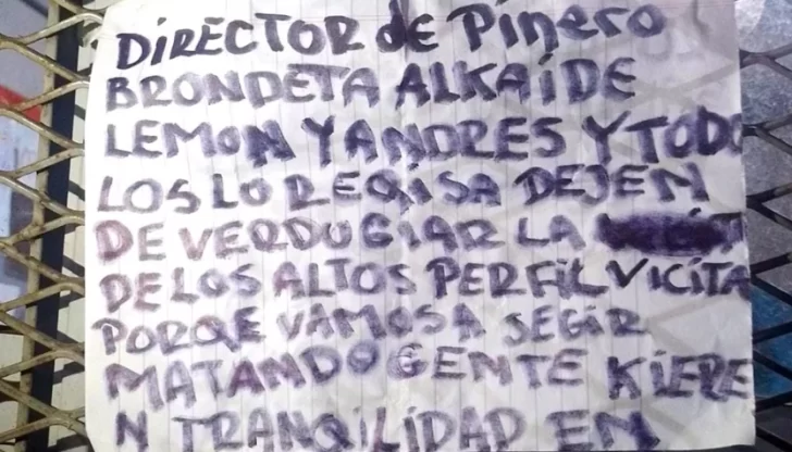 “Director de Piñero, Alcalde y personal de requisa: dejen de verduguear a las visitas de los alto perfil porque van a seguir matando gente. ¿Quieren tranquilidad?”, decía la nota con errores gramaticales y de ortografía. La señal es obvia: el penal de Piñero aloja a muchos de los hampones de las líneas medias de las principales bandas que operan en la zona.
