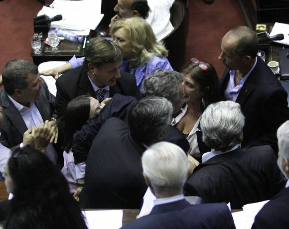 Fue ahí cuando un Rossi desencajado tomó la copa que tenía en su banca con supuesta intención de arrojarla y fue detenido por la vicepresidenta del bloque, Juliana Di Tulio. Después, mientras diputados del radicalismo, el peronismo opositor y el PRO denunciaban ’fraude’ en la votación, el jefe del bloque kirchnerista salió como disparado de su banca y amagó con ir a pelear al bloque de la UCR pero fue contenido por su par del FpV.