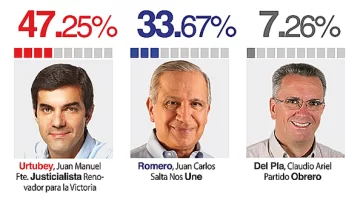 Salta, 12 de abril.-El gobernador Juan Manuel Urtubey dio hoy el primer paso en busca de acceder a un tercer mandato, ya que se imponía esta noche con comodidad en las elecciones primarias provinciales por el 47,28 por ciento de los votos contra el 33,67 por ciento del peronista disidente Juan Carlos Romero, que se ubicó segundo.