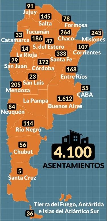 El informe, publicado por el diario Infobae y especificados en un decreto nacional, fue realizado entre agosto de 2016 y mayo de 2017 y detectó 4.100 asentamientos en todo el país.