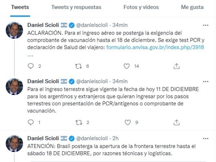 Sin embargo, 11.26, un nuevo tuit generó confusión: "Para el ingreso terrestre sigue vigente la fecha de hoy 11 de diciembre para los argentinos y extranjeros que quieran ingresar por los pasos terrestres con presentación de PCR/antígenos o comprobante de vacunación".