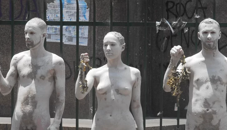 Buenos Aires, 22 de diciembre – Diez hombres y mujeres desnudos y cubiertos de barro fue la performance elegida para anunciar la construcción de un monumento de diez metros de altura elaborado con 260 mil llaves de bronce en homenaje a los Pueblos Originarios, con la idea de que el año del Bicentenario la obra reemplace a la estatua de Julio A. Roca, en Diagonal Sur y Perú, en la Ciudad de Buenos Aires.