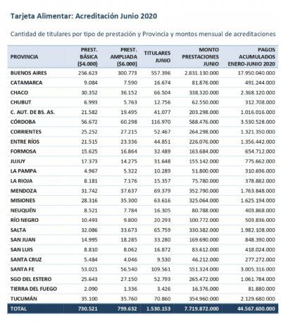 A continuación, un cuadro gráfico que ilustra los tipos de prestaciones de la tarjeta alimentar por provincia y sus fondos.