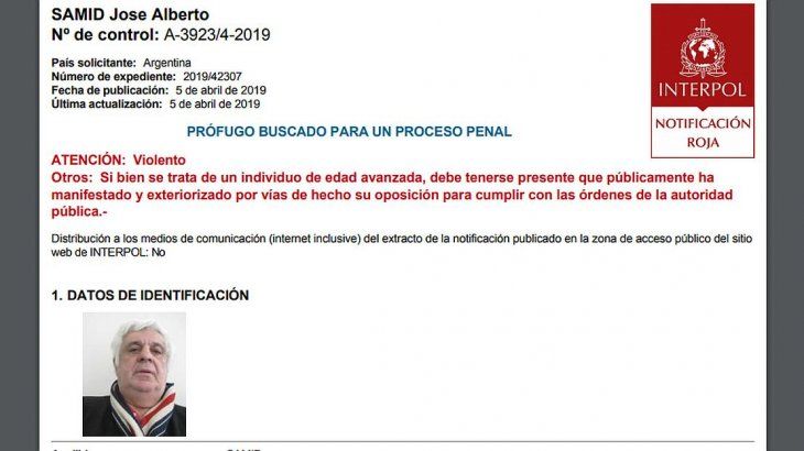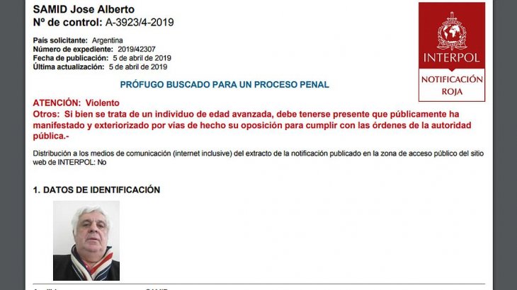"El buscado formaba parte de la cúpula de una organización delictiva, siendo Samid uno de los elementos más preponderantes de esa asociación Ilícita, que por intermedio de varios frigoríficos destinados a la venta de alimentos vacunos, y luego de la venta de los mismos, dicha organización retenía los impuestos que debían ser aportados a las arcas del Estado Nacional", explica la circular de Interpol.