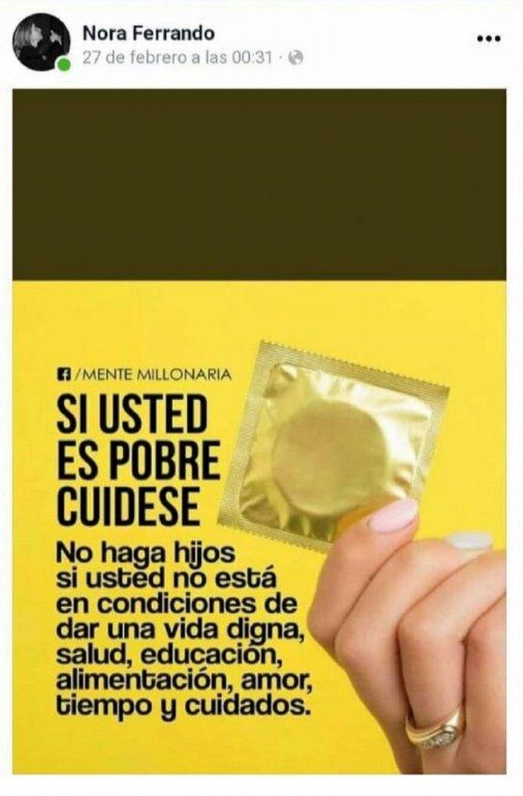 La directora de Cultura de la Municipalidad de Gualeguay, Nora Ferrando, compartió una polémica publicación en sus redes sociales, en la que se dirige a personas de bajos recursos y las insta a usar preservativos para no tener descendencia en caso de no poder hacerse cargo de la misma.