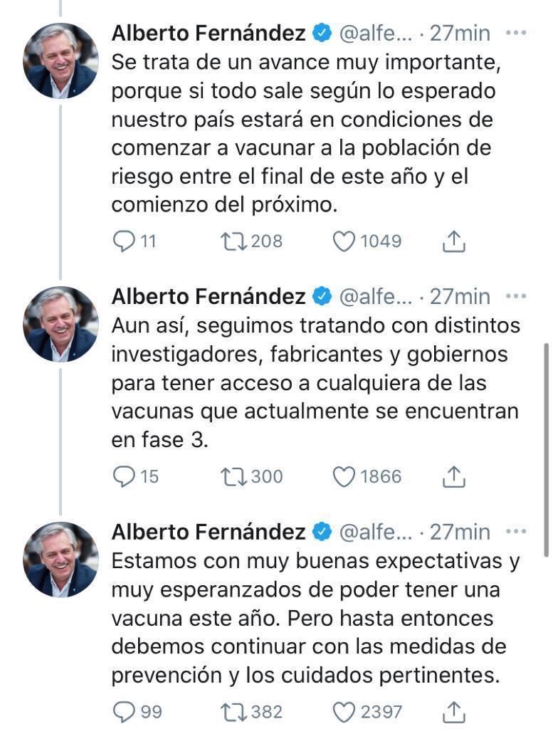 Además, manifestó que se trata de un avance muy importante porque “si todo sale según lo esperado nuestro país estará en condiciones de comenzar a vacunar a la población de riesgo entre el final de este año y el comienzo del próximo”, aclaró. Igualmente, aseguró que siguen “tratando con distintos investigadores, fabricantes y gobiernos para tener acceso a cualquiera de las vacunas que actualmente se encuentran en fase 3”.