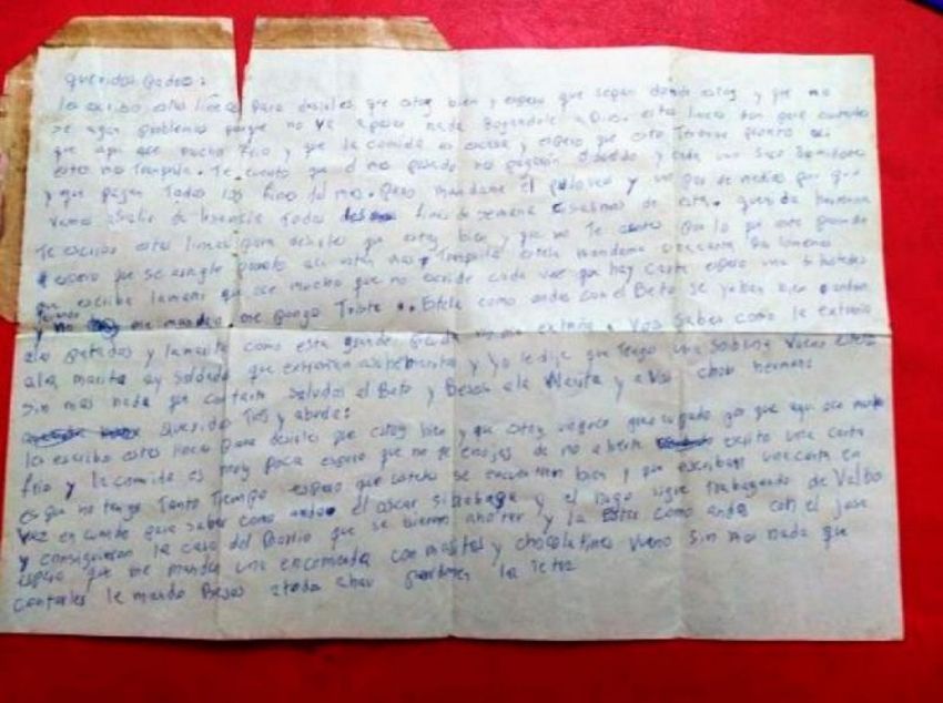 "Queridos padres: les escribo estas líneas para decirles que estoy bien y espero que sepan dónde estoy y que no se hagan problemas porque no va pasar nada, rogándole a Dios. Estas líneas son para contarles que aquí hace mucho frío y que la comida es escasa y espero que esto termine pronto así estás más tranquila. Te cuento que el mes pasado nos pagaron el sueldo y cada uno sacó 20 millones y que pagan todos los fines de mes. Pero mandame el pulóver y un par de medias porque vamos a salir de licencia, todos los fines de semana si salimos de ésta.