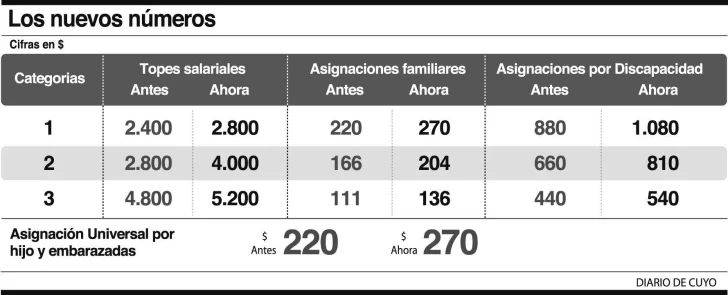 El Gobierno, asimismo, dio respuesta a otros de los grandes reclamos de los gremios al subir el tope salarial para el cobro de asignaciones familiares: ‘pasó de 5.200 a 7.000 pesos (una suba del 34,6%) ó a 14.000 pesos entre ambos cónyuges. Este cambio en el sistema de pago de asignaciones familiares se introdujo debido a la existencia de 63.331 casos en el que uno de los cónyuges percibe un salario inferior pero la suma de ambos supera largamente ese monto.