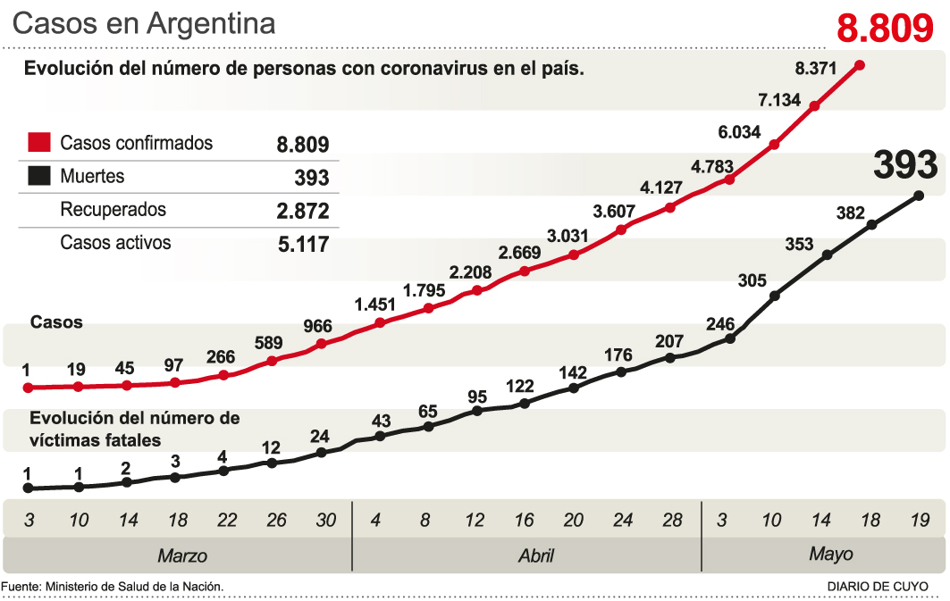 Once personas murieron y 438 fueron diagnosticadas con coronavirus en las últimas 24 horas en Argentina -en el mayor número de contagios en un día desde el inicio de la pandemia-, con lo que llega a 393 el total de fallecidos y 8.809 los infectados, anunció ayer el Ministerio de Salud de la Nación en su informe vespertino.