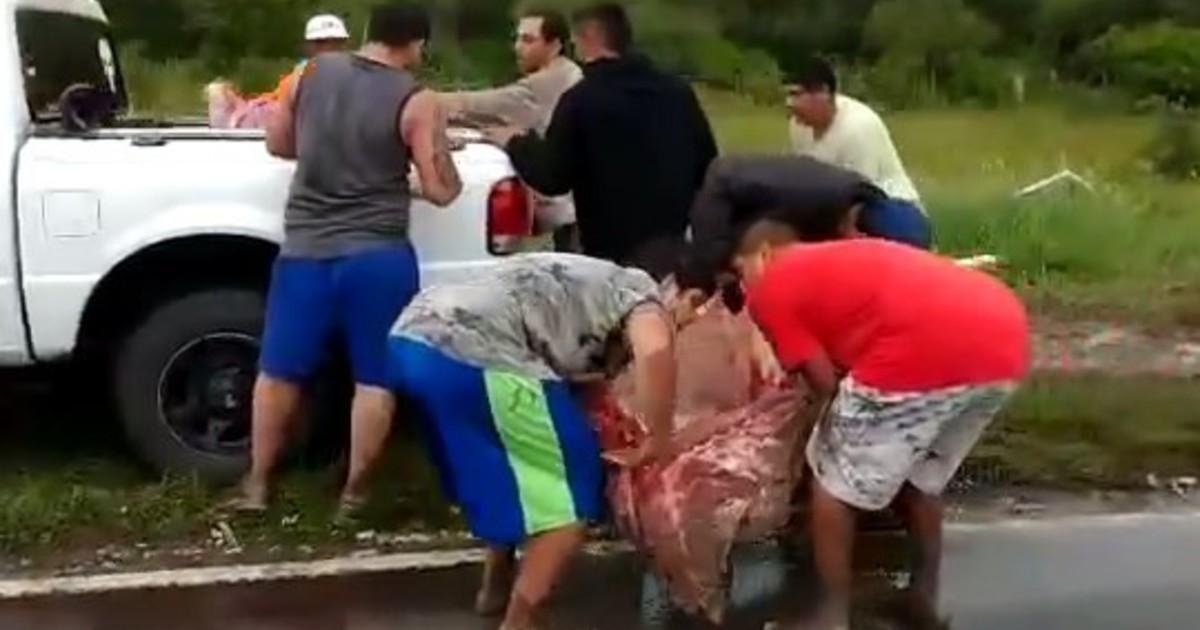 En varios videos que han circulado por las redes sociales se puede observar cómo las personas cargaban los autos con el alimento, más allá de que estuviera tirada en el camino sin la respectiva cadena de frío.