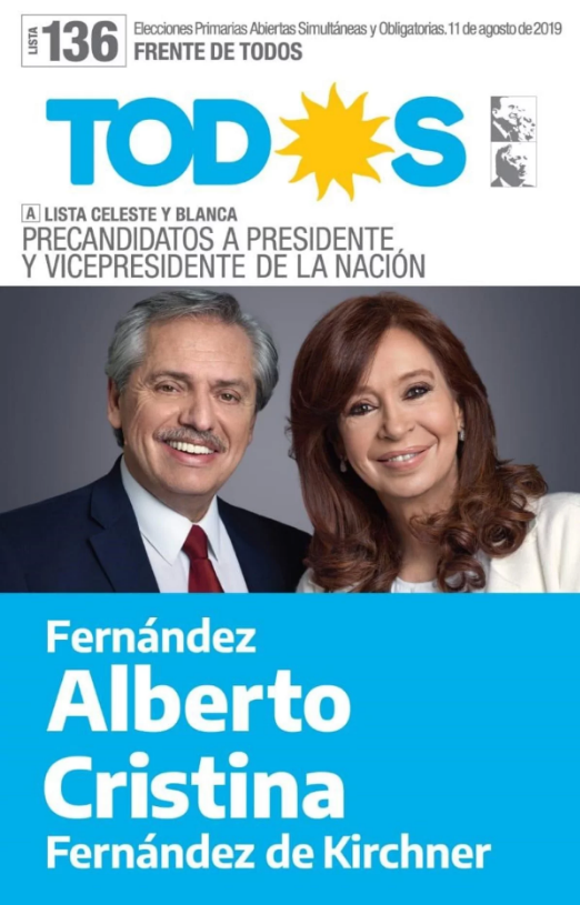El nombre de Macri aparece más grande que el de Pichetto. Esa es una de las diferencias con la de frente kirchnerista Todos. Allí, los nombre de Alberto Fernández y Cristina Kirchner tienen el mismo tamaño. Además, la ex presidenta y ahora candidata a vice está por delante de Alberto, cuando lo lógico es que el candidato presidencial esté al frente.