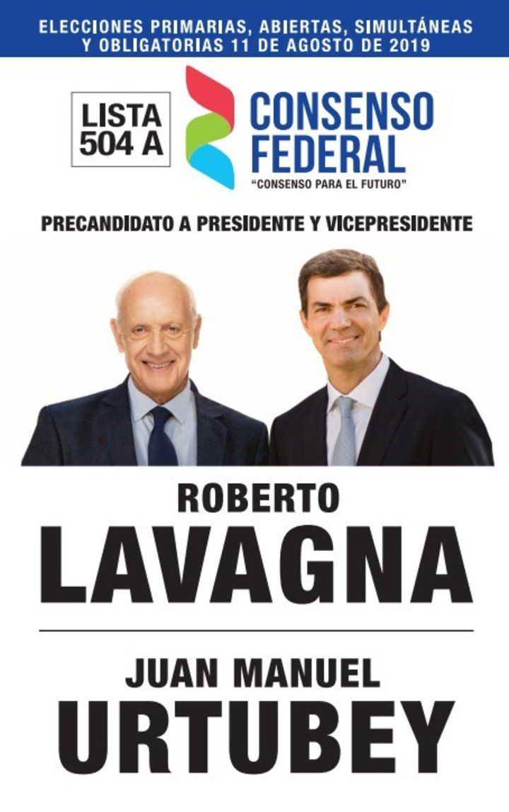La de Consenso Federal que lleva a Roberto Lavagna y Juan Manuel Urtubey es más clásica. Fondo blanco, sonrisas de los candidatos que aparecen vestidos con traje oscuro. En el bunker lavagnista dicen que la foto elegida fue la única en la que Lavagna sonrió.