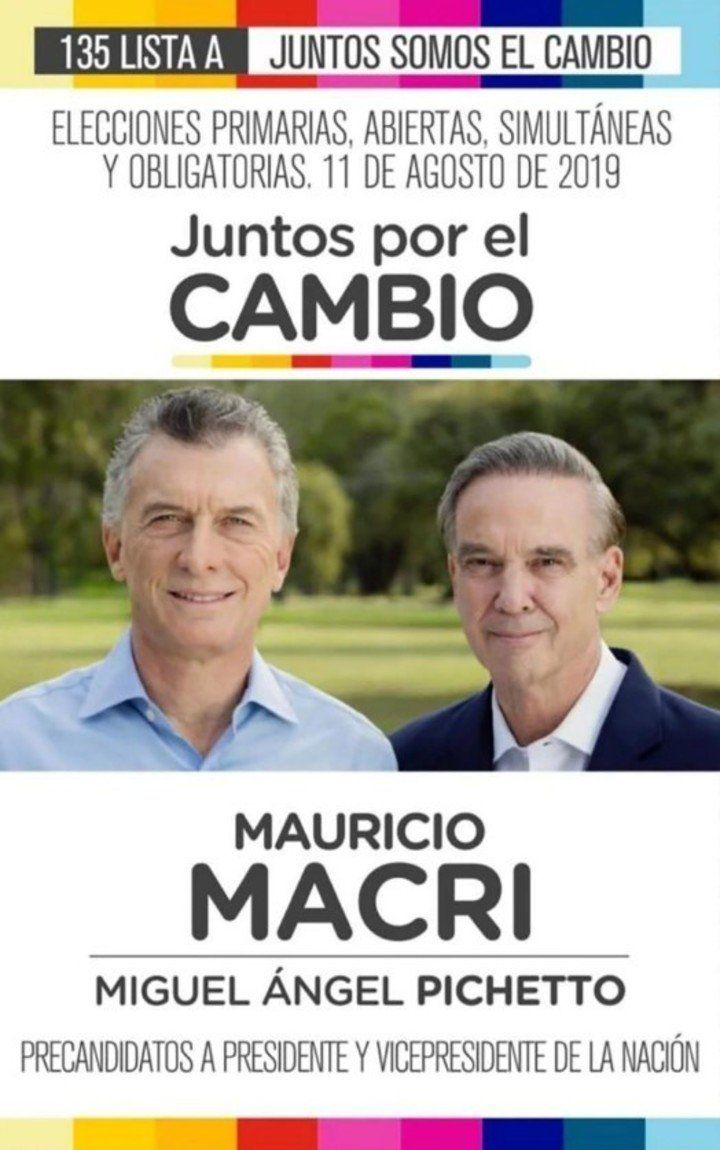 En la de Juntos Por el Cambio Mauricio Macri y Miguel Ángel Pichetto aparecen juntos. La novedad es que el candidato a vice no lleva puesta corbata -uno de sus sellos- en la búsqueda de descontracturarlo. Además, ya no hay preponderancia del color amarillo y aparece la paleta de multicolor color que ahora identifica al frente del oficialismo.