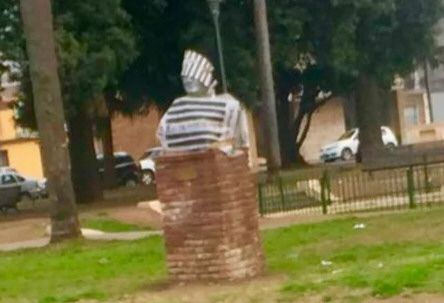 En la imagen se observa que sobre el busto se colocaron cintas que emulan las rayas blancas del traje que utilizaban los presos. El hecho ocurrió luego de que varios empresarios reconocieron ante la Justicia el pago de coimas a exfuncionarios de la era kirchnerista, dinero que de acuerdo a los registros de Oscar Centeno llegó en varias oportunidades al departamento del matrimonio Kirchner, en el barrio de Recoleta, en la Ciudad Autónoma de Buenos Aires.