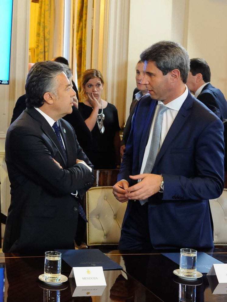 Diálogo. En medio de la reunión entre los gobernadores y el presidente Macri, Sergio Uñac compartió unas palabras con Alfredo Cornejo, de Mendoza.