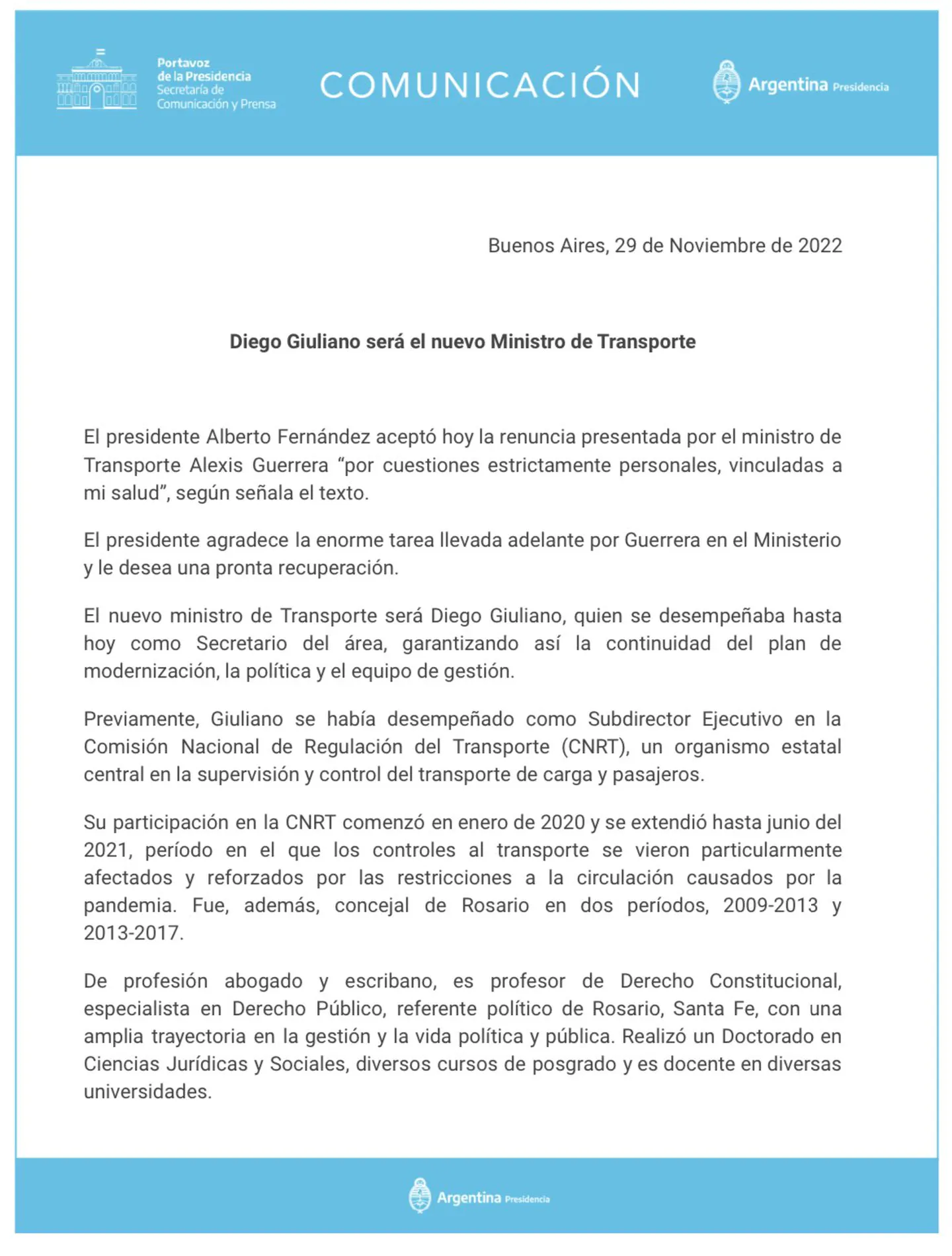 “El presidente Alberto Fernández aceptó hoy la renuncia presentada por el ministro de Transporte, Alexis Guerrera ‘por cuestiones estrictamente personales, vinculadas a mi salud’”, inicia el texto enviado por el Gobierno.