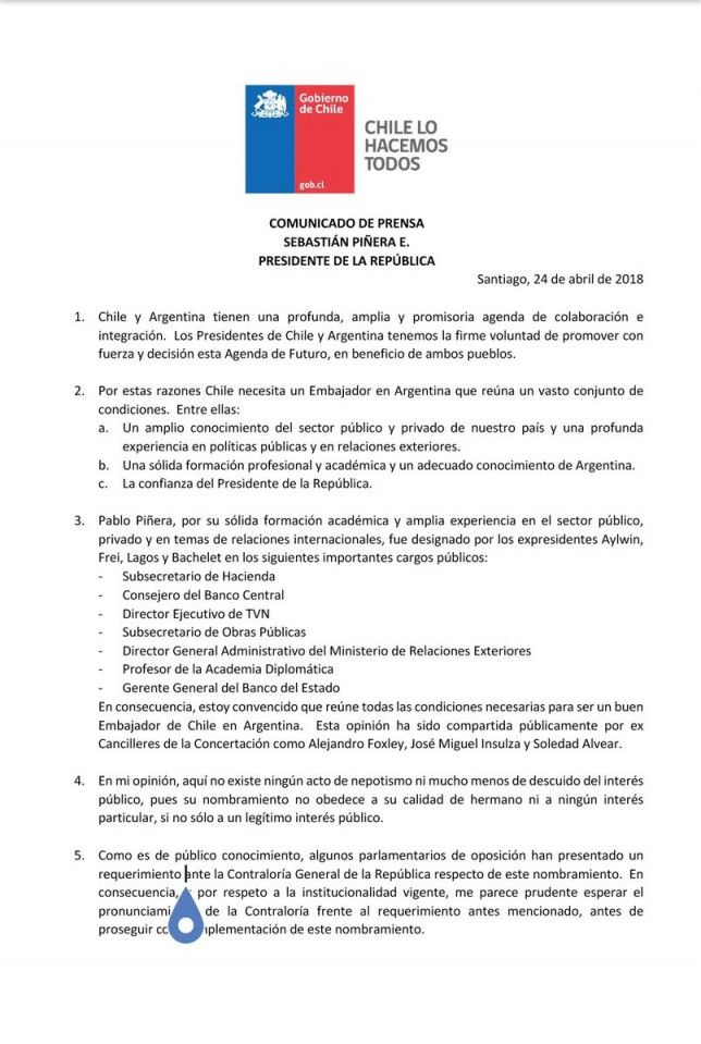 El presidente de Chile buscará la aprobación de la Contraloría para que Pablo Piñera sea el representante diplomático en nuestro país.
