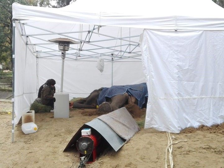 El sábado a la mañana se recostó, después de haber estado casi dos años y medio parada. Así dormía y pasaba los días. Un equipo de expertos que incluyó al coordinador del santuario de elefantes de Mato Grosso y un especialista de una fundación americana, estuvieron al frente de los tratamientos de emergencia todo el fin de semana
