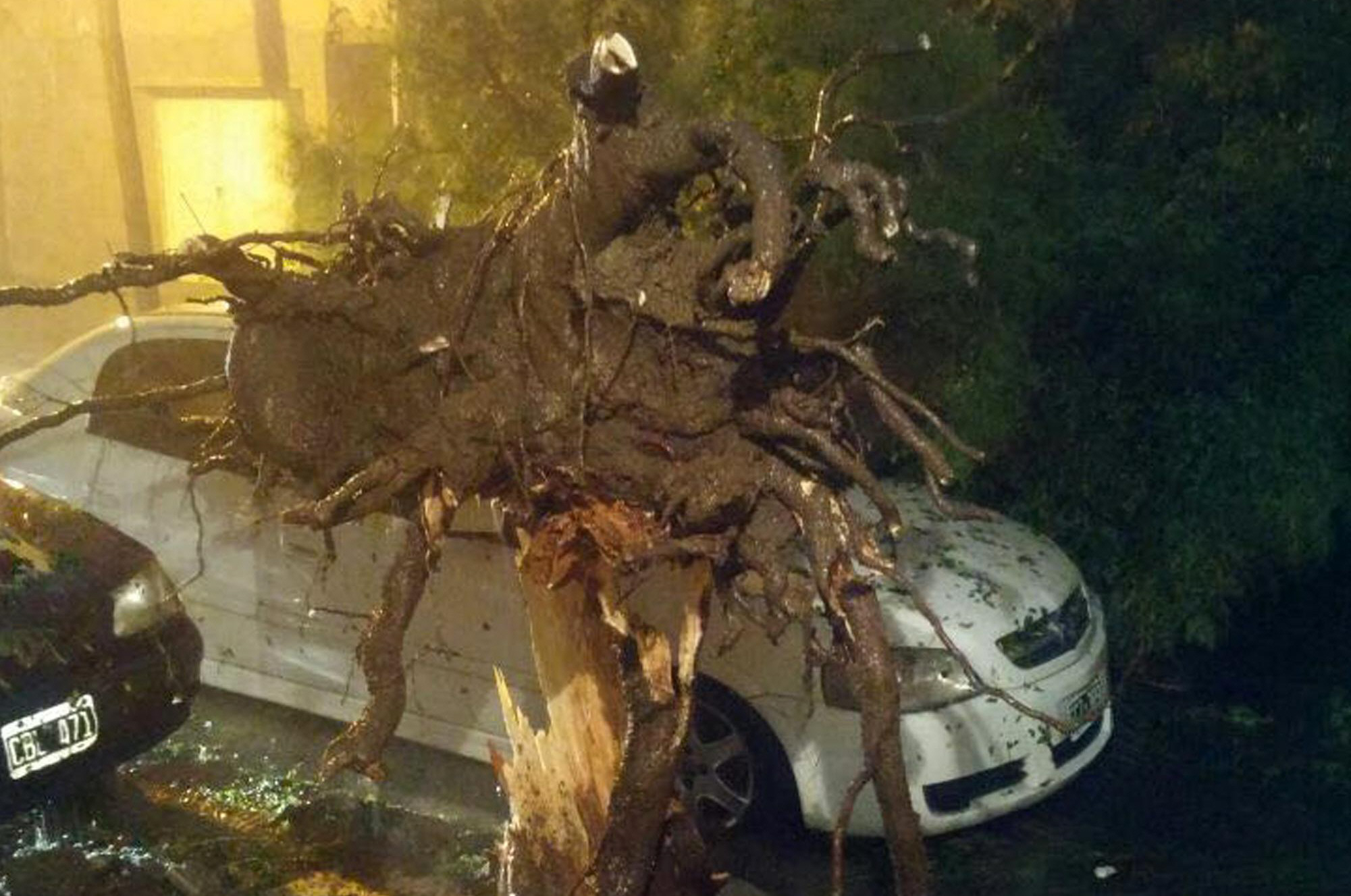 La fuerza de los vientos provocó la caída de más de una docena de árboles, voladuras de techos y un derrumbe en una casa precaria, a la vez que tres vehículos fueron aplastados por árboles o postes.