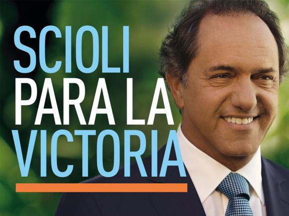 La pieza propagandística muestra a Daniel Scioli sonriente, de traje y corbata en la gama de los azules y con camisa blanca sobre el margen derecho, y a su izquierda la leyenda “Scioli para la victoria” en celeste y blanco.