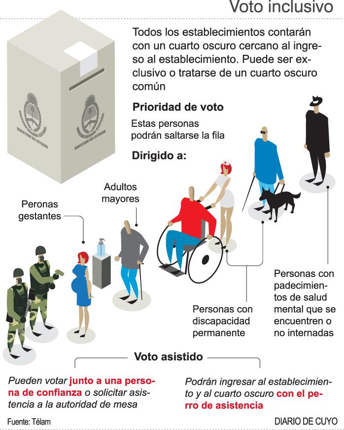 En los fundamentos de la medida se recordó que mañana deberá garantizarse la existencia del cuarto oscuro accesible (COA) para personas con dificultades motrices u otras, que deberá estar en la planta baja del lugar de votación y lo más próximo posible a la entrada del edificio. Se deberá evitar la presencia de barreras u obstáculos de cualquier tipo y coordinar medidas de asistencia. Cada delegado electoral deberá facilitar a toda persona con discapacidad "el acceso al establecimiento y al COA", mientras que los electores ciegos podrán sufragar asistidos por el presidente de mesa.