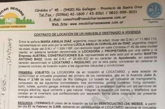 Medios de prensa mostraron una facsímil del documento -foto- que, bajo el título ‘contrato de locación de un inmueble destinado a vivienda‘, lleva las firmas de María Amalia Díaz y Lucila Amalia Corvalán de Díaz (nombradas como la parte ‘propietaria‘), y de Martín Báez -hijo de Lázaro-, en representación de Austral Construcciones como ‘locatario o inquilino‘. Tanto el exsecretario López como el empresario, uno de los principales beneficiados por las licitaciones de obra pública durante el kirchnerismo, comparten hoy el Penal de Ezeiza.