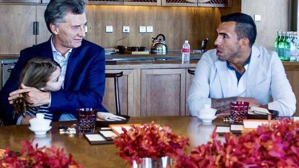 El presidente Mauricio Macri saludó este jueves al ex delantero de Boca Juniors Carlos Tevez, quién actualmente milita en el club Shanghái Shenhua de la Superliga China.