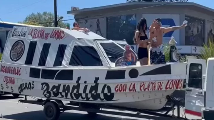 Como si se tratara de carnaval, la carroza con forma de embarcación y tripulada por dos personas que emulaban al exjefe de Gabinete de Axel Kicillof y la modelo navegó por la avenida Hipólito Yrigoyen y la zona comercial de Lomas de Zamora.
