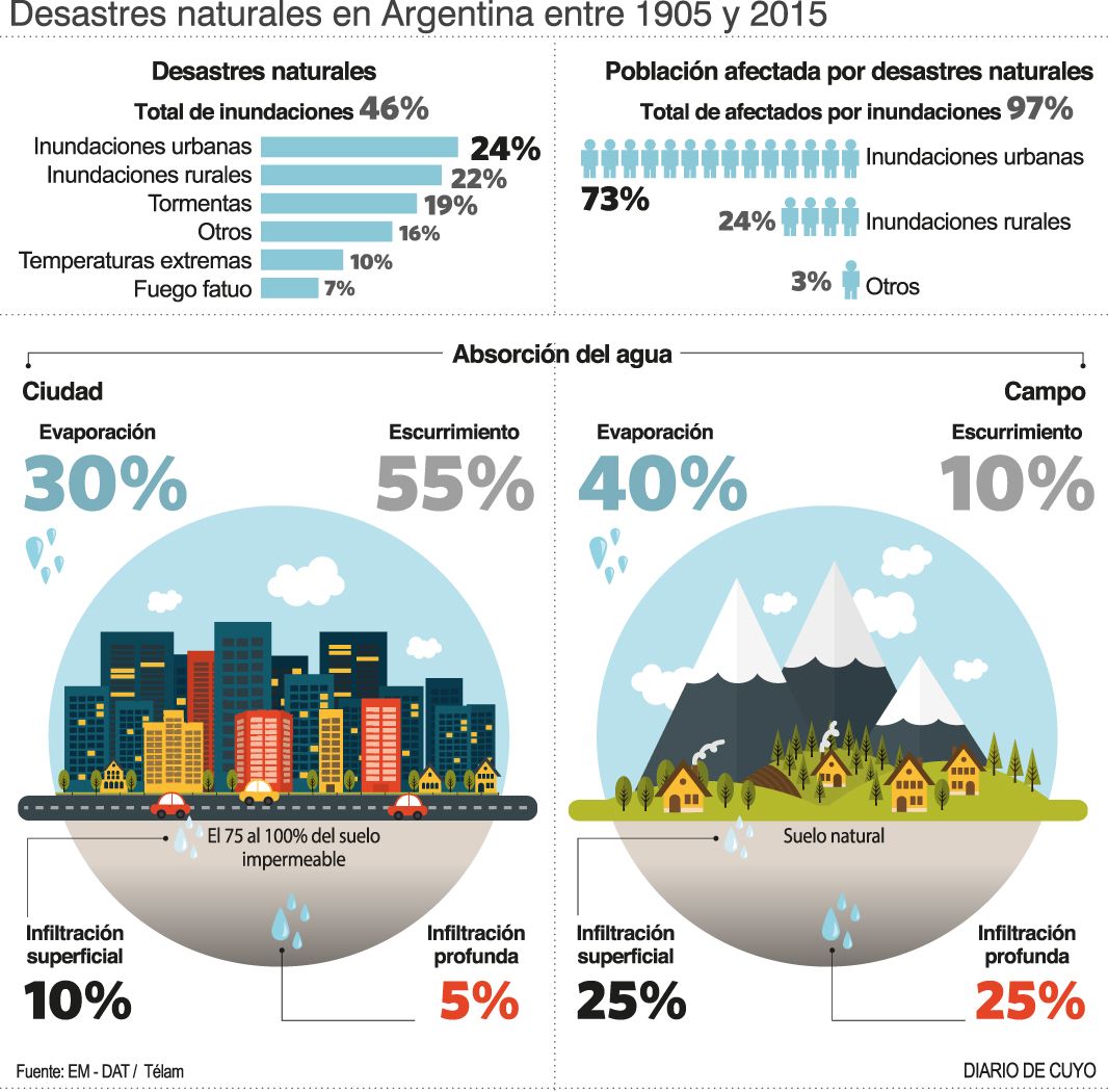 Según datos oficiales, sólo en el 2016 se produjeron pérdidas por 1.300.000 dólares y 72.119 personas sufrieron el castigo de las inundaciones. Los científicos y académicos Vicente Barros e Inés Camilloni, miembros del Centro de Investigaciones del Mar y la Atmósfera (CIMA-UBA-Conicet), resaltaron que 90% del total de la población está concentrada en unos 800 centros urbanos, la mayoría de ellos ubicados en inmediaciones de ríos o en zonas bajas e inundables.