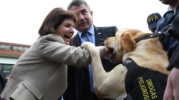 La perlita de la tarde se produjo cuando la ministra hizo un recorrido en el predio para saludar y observar el nuevo equipamiento y saludar a los oficiales: cuando Bullrich se acercó al clan de perros, un labrador, como jugando, se abalanzó contra la funcionaria y simuló morderle el brazo. En la foto puede verse cómo la ministra sonríe ante el juego del perro.