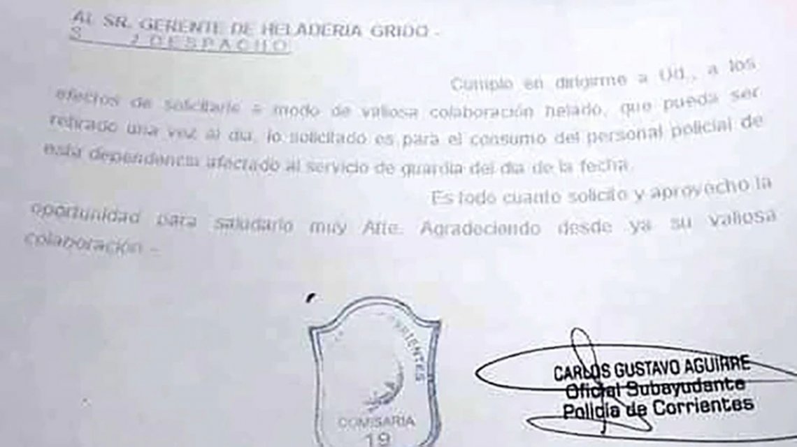 Un efectivo de policía de la provincia de Corrientes solicitó por escrito al gerente de una heladería que le regale un kilo de helado por día para compartir con sus compañeros.
