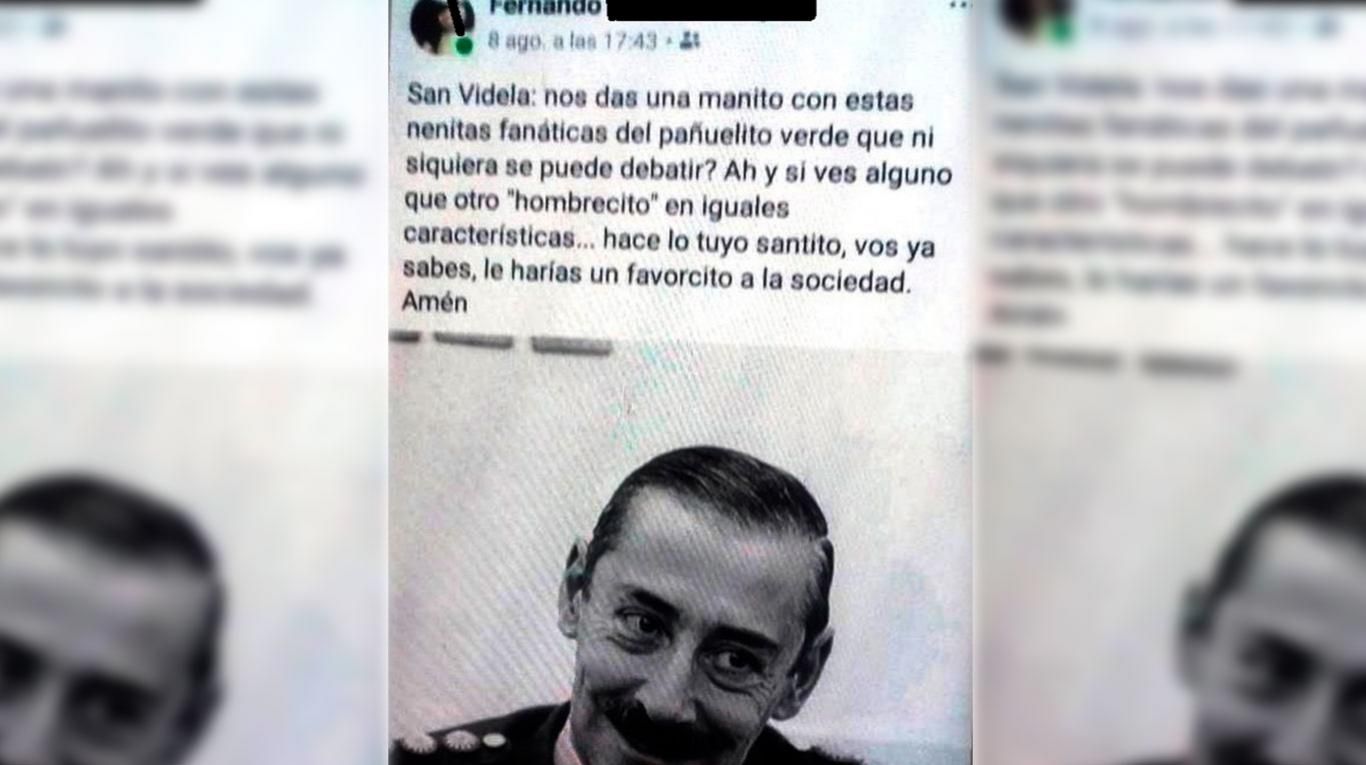 El mensaje no tardó en viralizarse y el escándalo creció a pasos agigantados en Río Gallegos. Un docente le pidió a "San Videla" que actúe en contra de las mujeres "del pañuelo verde", en referencia a quienes están a favor del aborto legal. Fernando, de unos 35 años, dicta clases en la Colegio Secundario 39 y en el Instituto Provincial de Educación Superior (IPES) y fue el autor del polémico texto en Facebook. Acompañó el posteo con la foto del represor Jorge Rafael Videla.